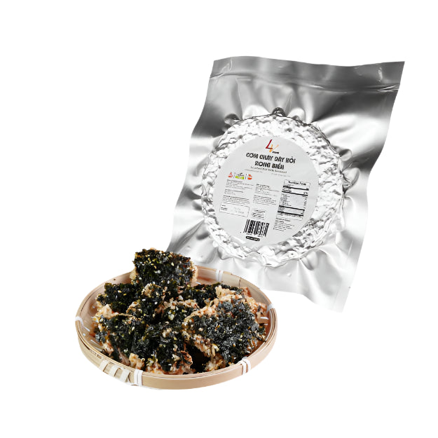 Cơm cháy đáy nồi rong biển là một món ăn kết hợp giữa hương vị giòn giòn của cơm cháy và sự đậm đà, thơm ngon của rong biển, mang đến một trải nghiệm ẩm thực độc đáo và đầy hấp dẫn. Lớp cơm cháy giòn tan được tạo ra từ phần gạo nấu ở đáy nồi, được chế biến tỉ mỉ, đảm bảo độ giòn mà không bị khô. Rong biển được chọn lọc kỹ càng, có hương vị mặn mòi đặc trưng của biển, tạo nên sự kết hợp hoàn hảo, vừa thơm ngon lại bổ dưỡng.
