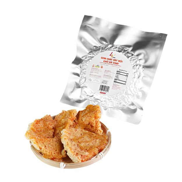 Cơm cháy lứt đáy nồi chà bông chay là món ăn kết hợp giữa hương vị giòn tan của cơm cháy và độ mềm mại của chà bông chay, mang đến một trải nghiệm thú vị cho người ăn. Cơm cháy được làm từ gạo lứt, không chỉ thơm ngon mà còn cung cấp nhiều dưỡng chất tốt cho sức khỏe như chất xơ và vitamin. Phần chà bông chay làm từ nguyên liệu thực vật, giàu đạm thực vật, mang lại hương vị đậm đà, dễ ăn, không hề thua kém so với chà bông truyền thống.